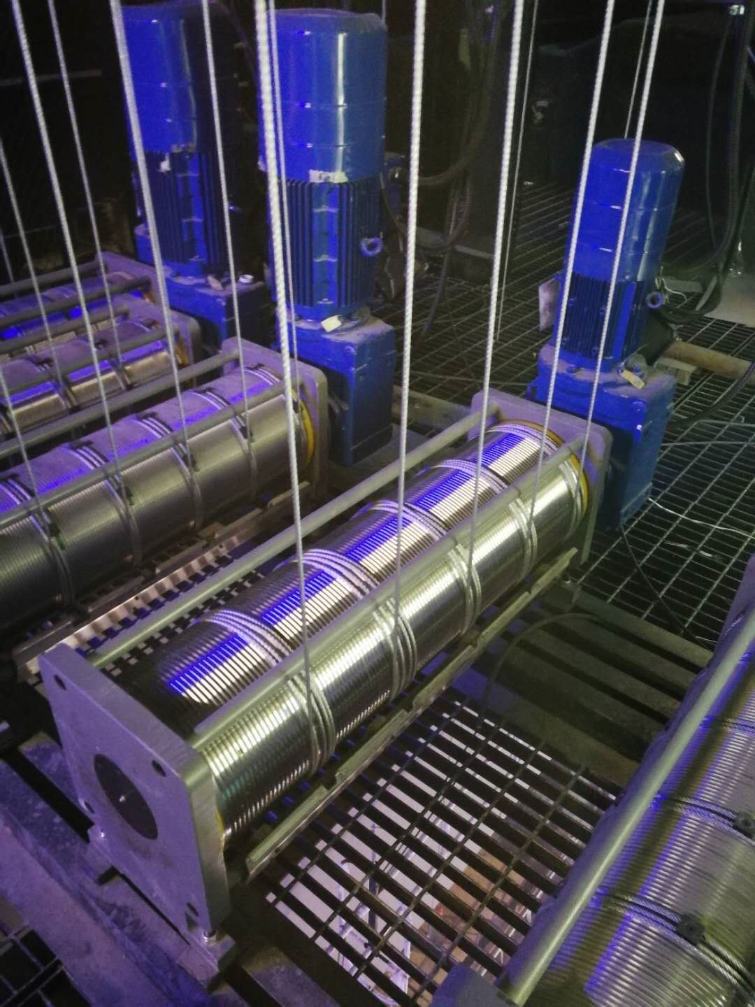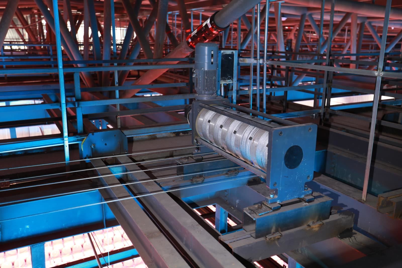 鋼絲繩路徑:鋼絲繩從卷筒引出到滑輪組的轉(zhuǎn)向滑輪,由此引向燈架(桿體)。鋼絲繩通過其他燈架中的轉(zhuǎn)向滑輪再次轉(zhuǎn)向,經(jīng)過柵頂下方,在此固定在鋼結(jié)構(gòu)上。含必要的轉(zhuǎn)向滑輪。