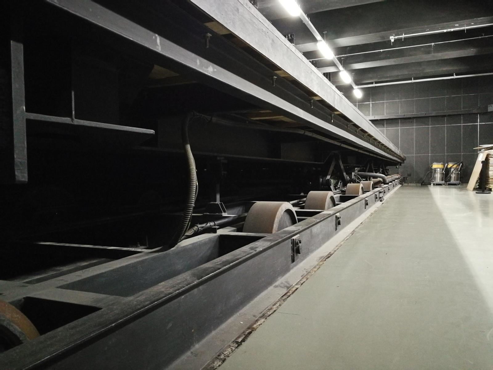 芭蕾舞車臺由安裝在鋼架的支撐輪和2個齒輪架上(齒條驅動時)的鋼結構桁架組成。外部驅動裝置隱藏在芭蕾舞車臺臺體和主升降臺臺面之下。與臺車下部的齒條嚙合,向臺車傳送動力。由設置在第三、四塊主升降臺上的驅動裝置通過接力技術完成整個行程驅動?;蚩捎呻妱幽Σ凛喬峁┬凶邉恿Α?/p>
