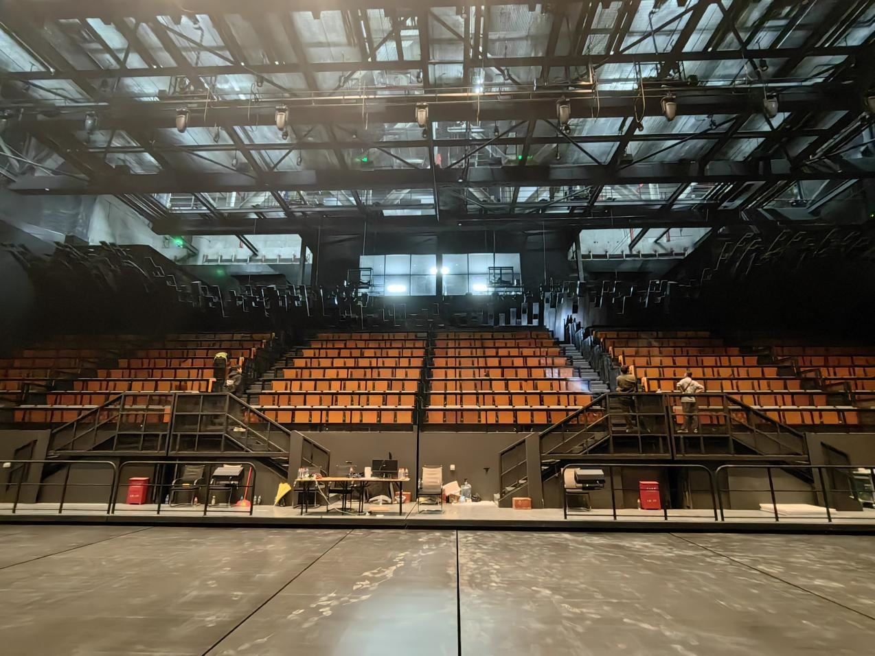 每個(gè)臺(tái)階安置整排觀眾席座椅,單套設(shè)備可容納觀眾80人,同時(shí)設(shè)置進(jìn)場(chǎng)/散場(chǎng)通道貫穿臺(tái)體前后。該設(shè)備從空間動(dòng)感、